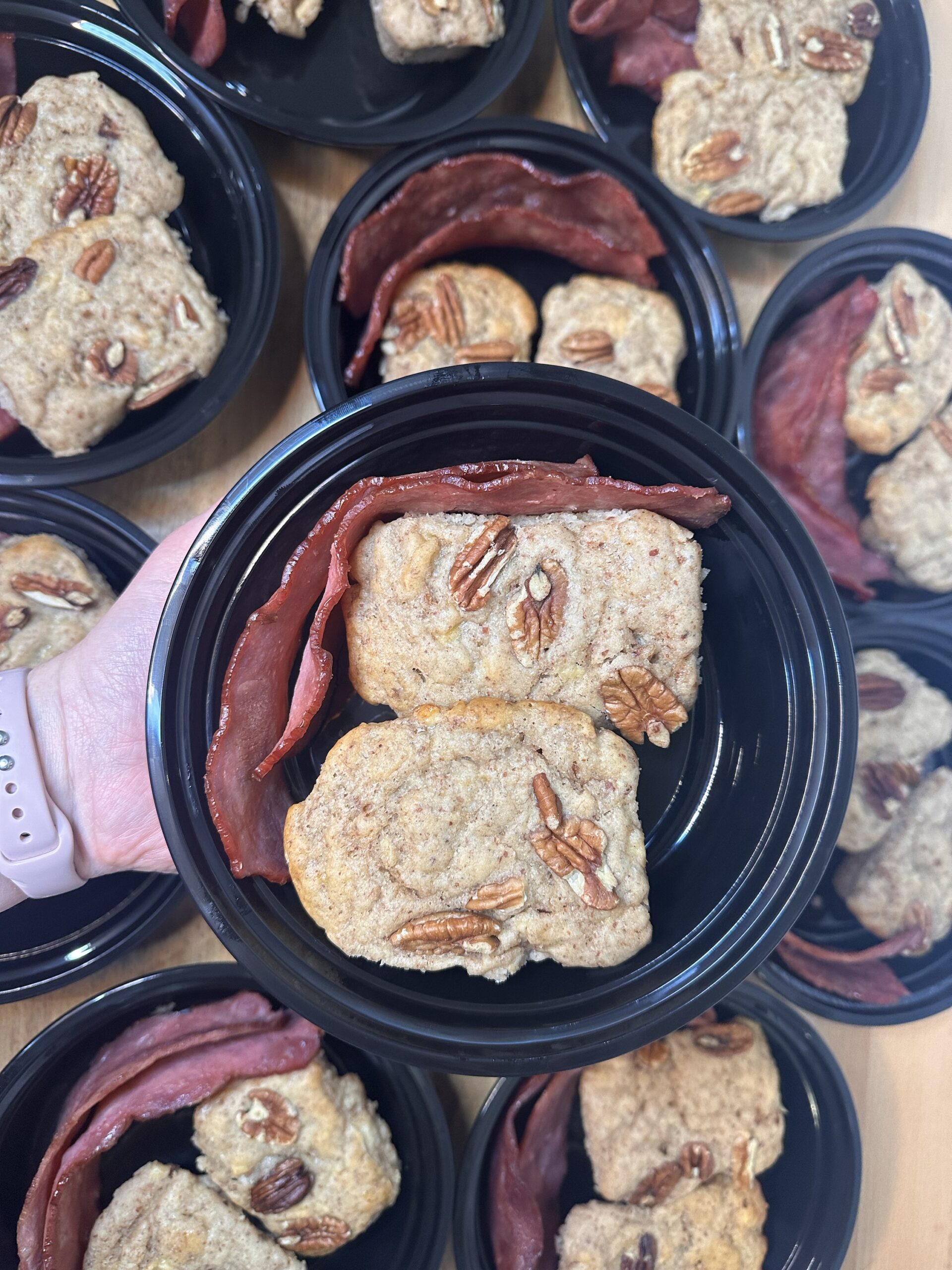 Get your favorite breakfast comfort food on the go! Gluten free, made with real bananas and pecans, and sweetened with local honey. Two mini loaves served with turkey bacon.