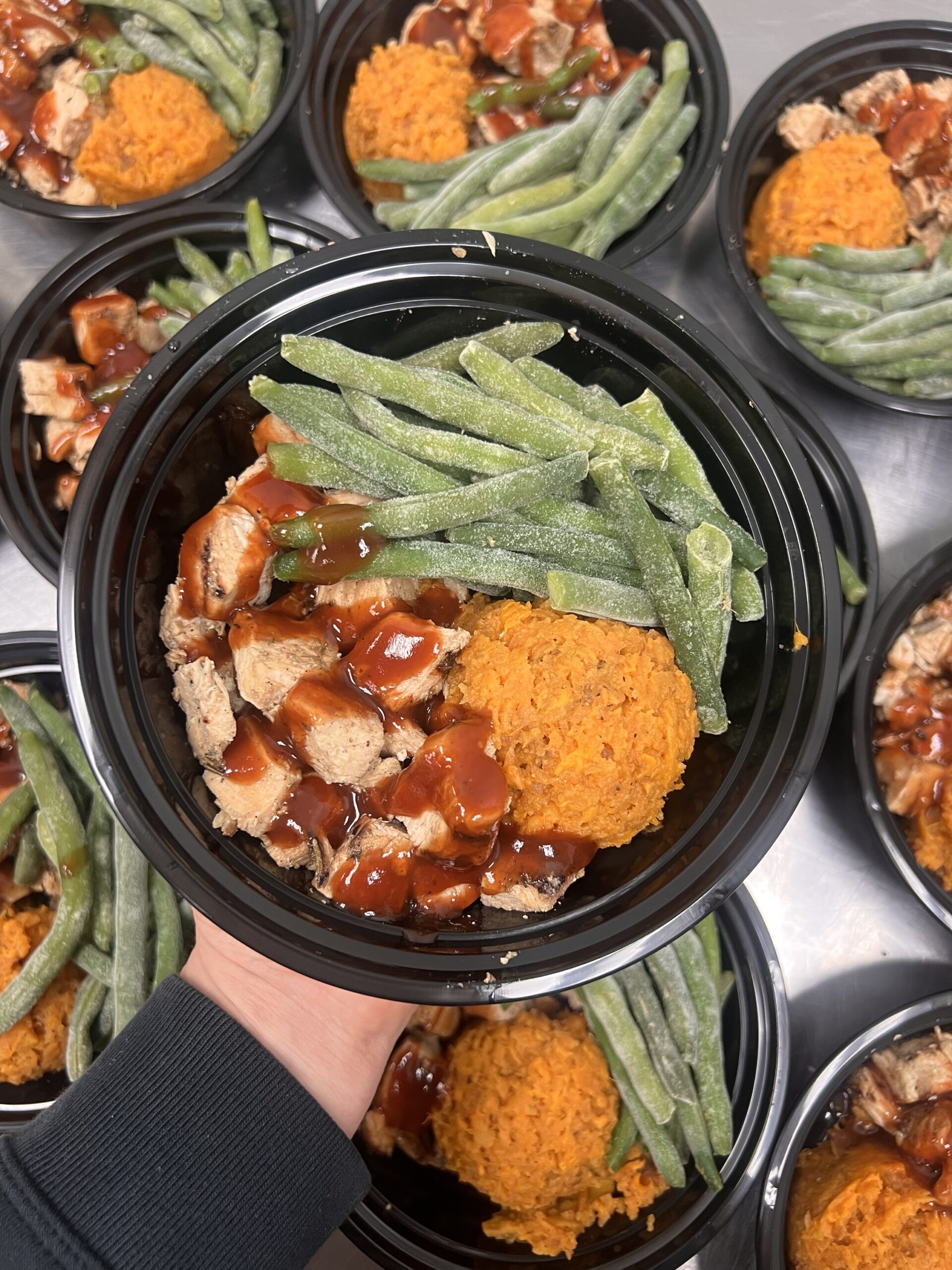 Marinated grilled chicken breast tossed in our mouth-watering BBQ sauce. Served with smashed sweet potatoes and green beans.