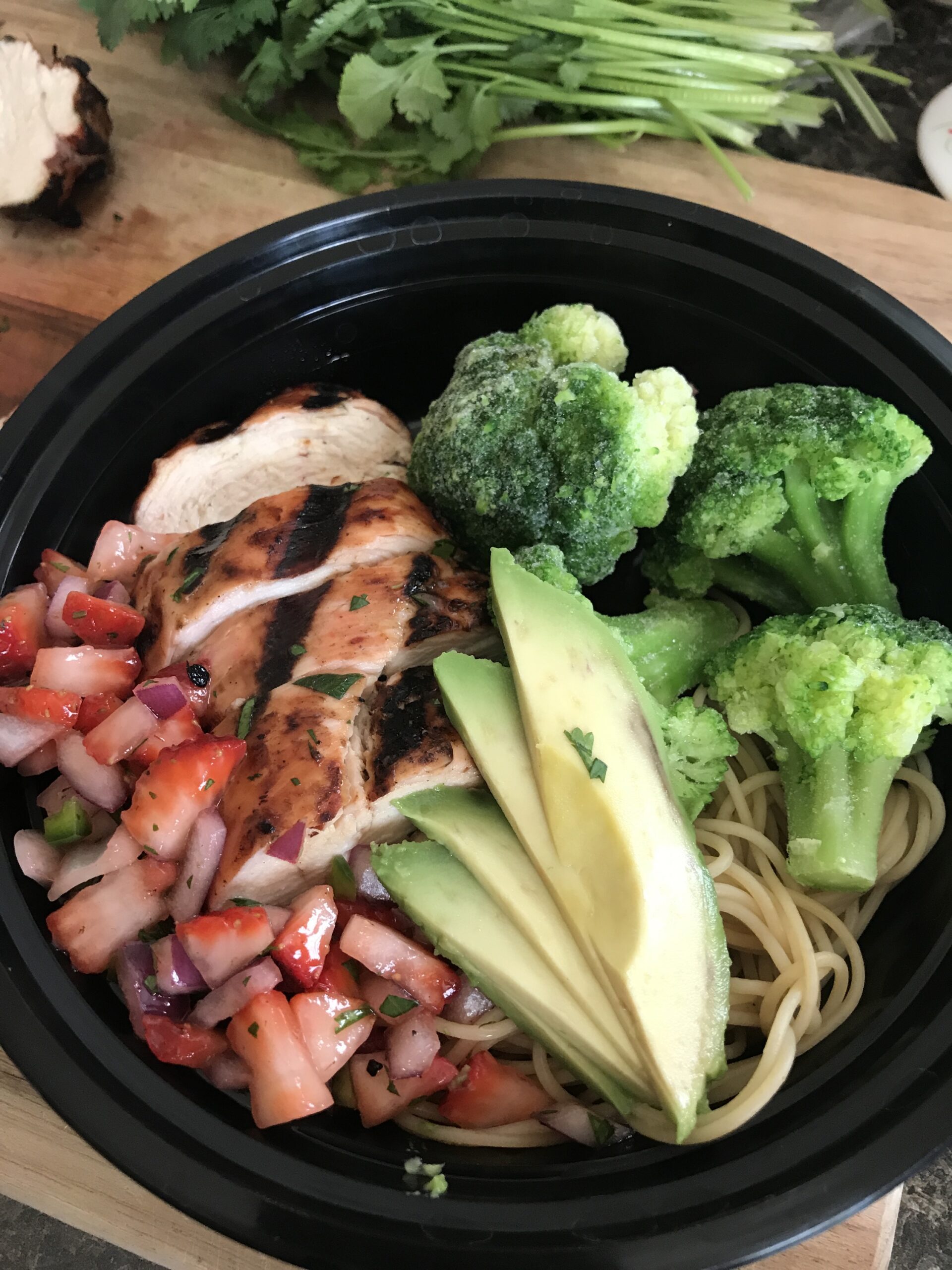 This meal is finally coming out of retirement!! It was TOO GOOD to never cook again. Grilled chicken marinated in a housemate strawberry vinaigrette and topped with our homemade strawberry jalapeño cilantro salsa. Served with protein pasta and steamed broccoli florets.