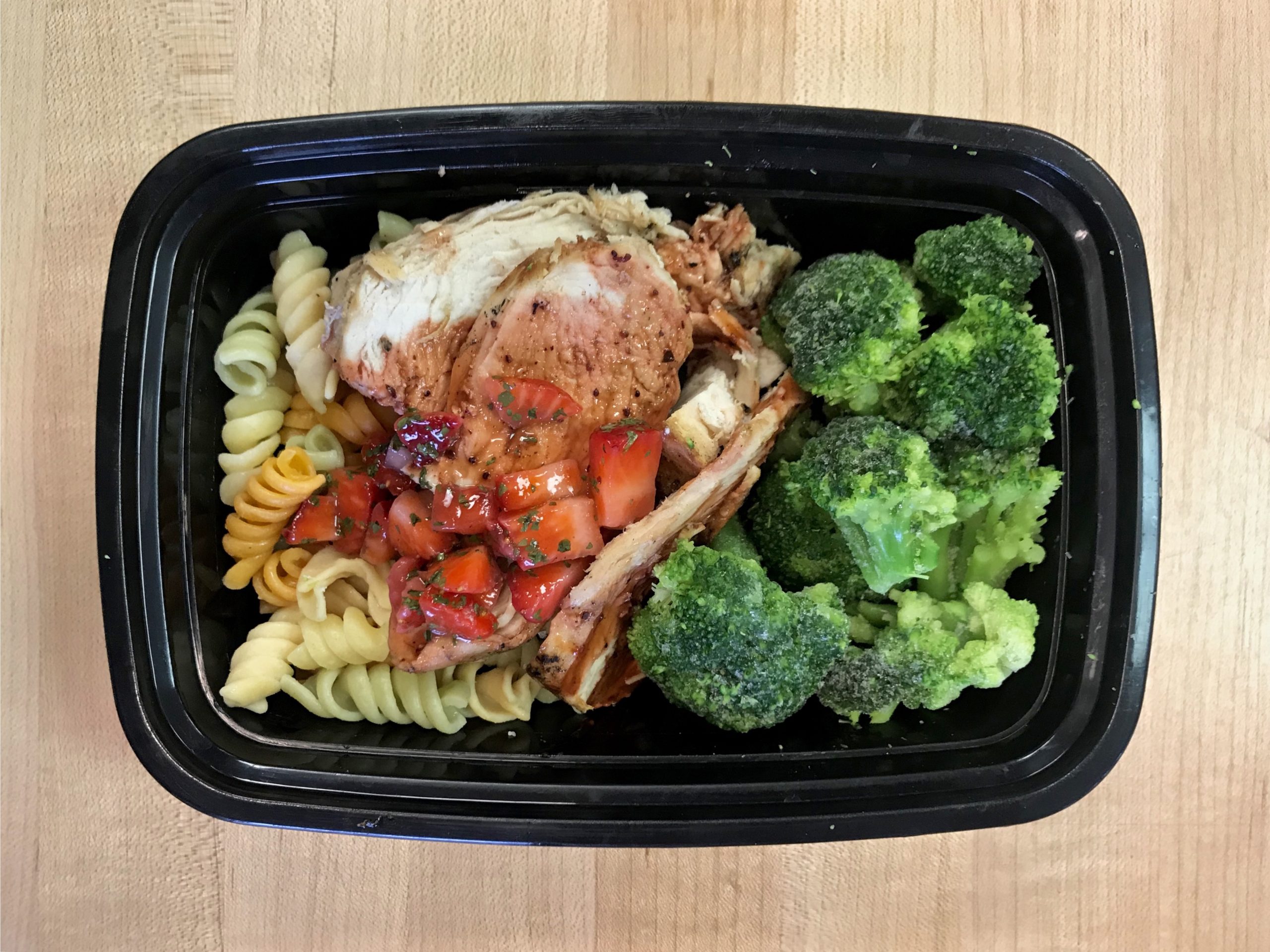 This meal is finally coming out of retirement!! It was TOO GOOD to never cook again. Grilled chicken marinated in a housemate strawberry vinaigrette and topped with our homemade strawberry jalapeño cilantro salsa. Served with protein pasta and steamed broccoli florets.