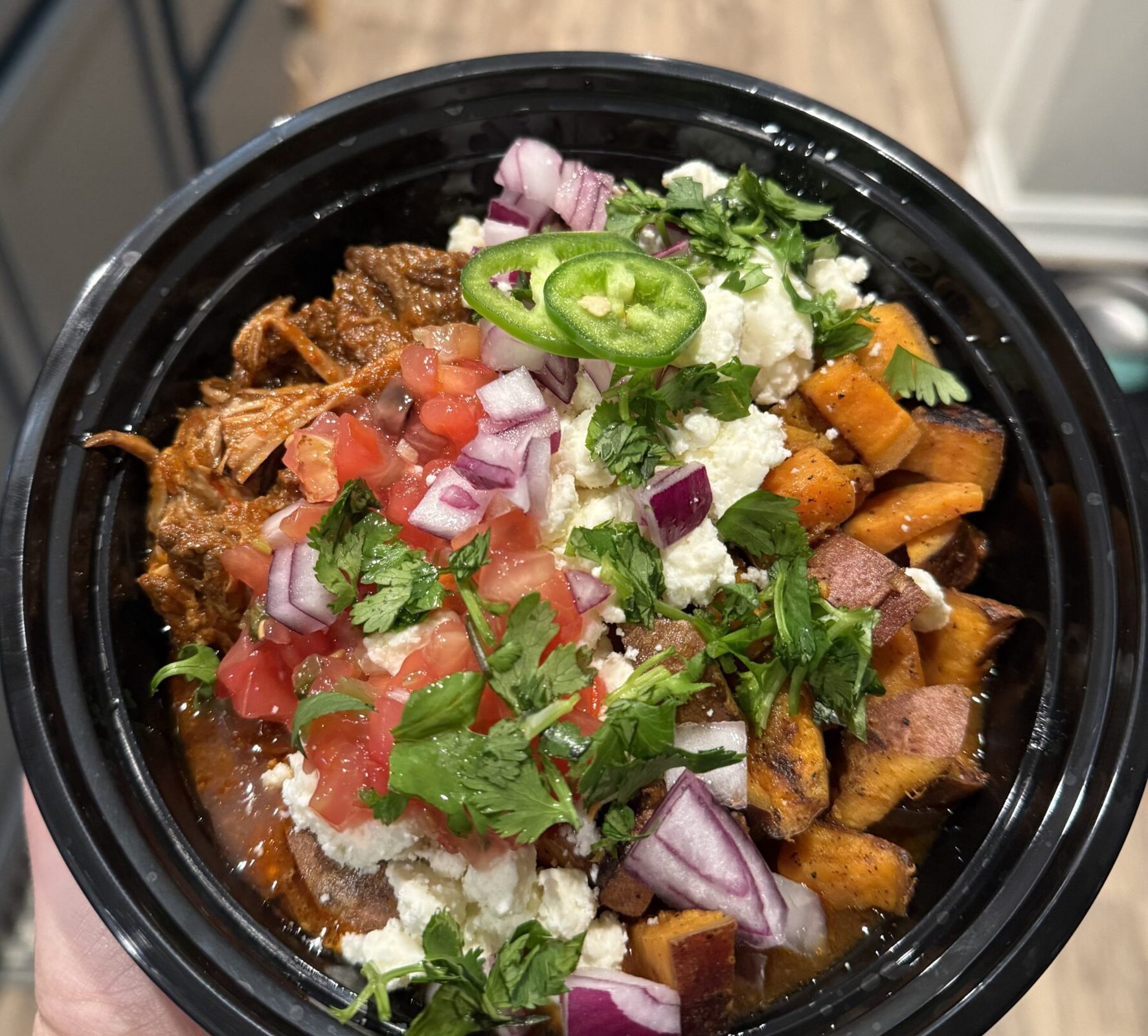 These slow-braised shredded beef bowls are AMAZING!! Our locally sourced, grass fed, grass finished beef is seasoned with rich Mexican spices, served over seasoned sweet potatoes with queso fresca, fresh red onion, tomato, cilantro and jalapeno slices to garnish