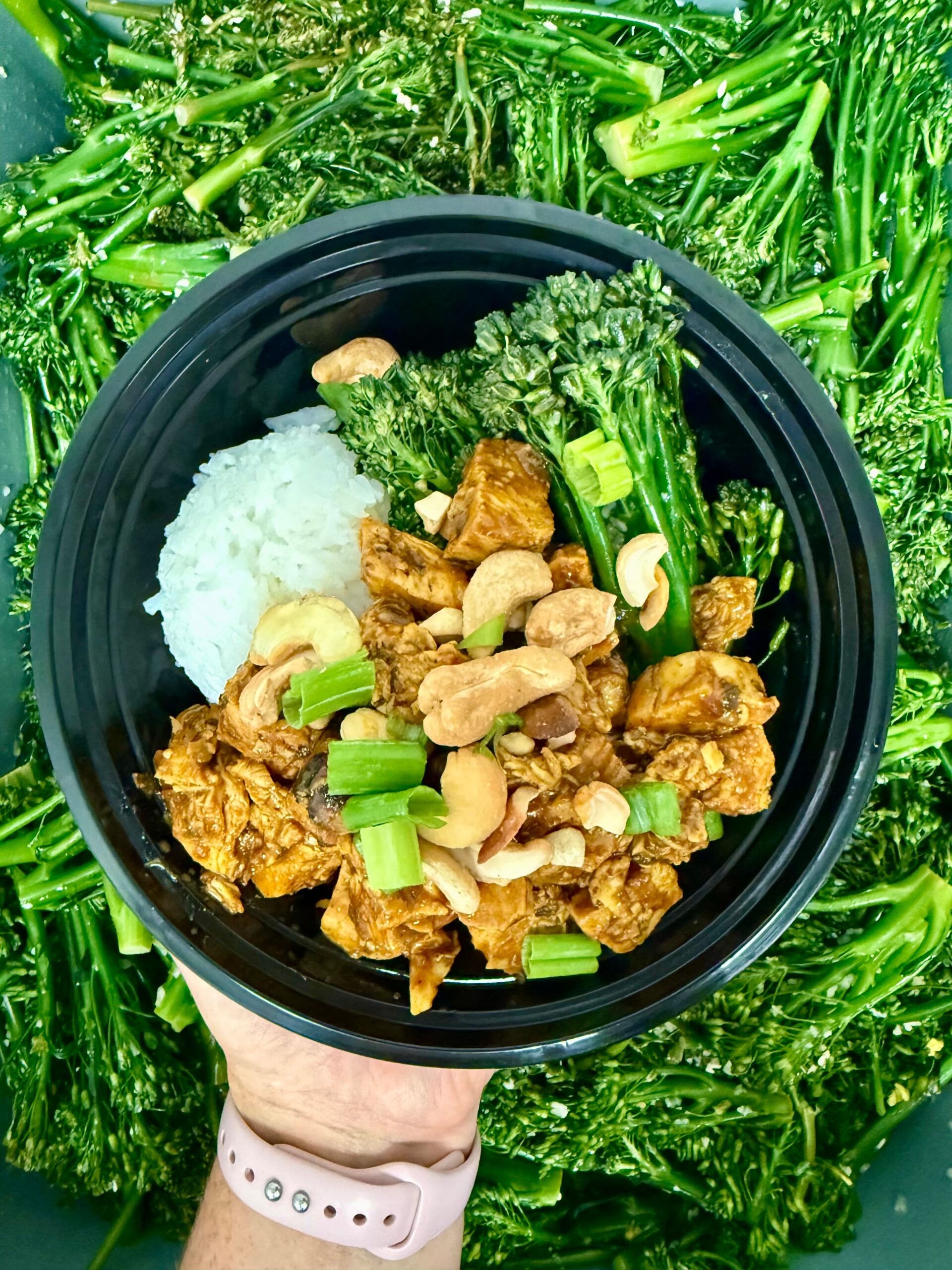 Our signature marinated chicken, now drenched in Thai sauce. ย Served with jasmine rice and our tender broccolini. ย All topped off with fresh parsley and roasted cashews
